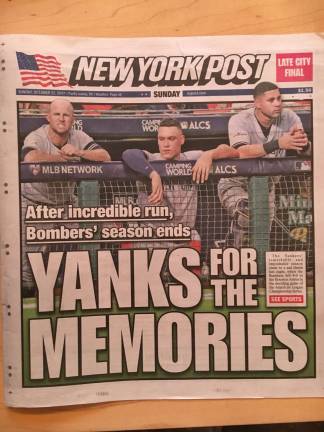 Then I suddenly remembered why: The Yankees’ magical, Cinderella-like season was officially over. The good guys had lost game 7 the night before to the Houston Astros, 4-0, in a contest that really wasn’t even that close. The Yanks got three measly hits. After scoring one run in each of the previous three playoff games played in Houston during this series, this time they outdid themselves in futility and got shut out. And in what has become practically obligatory by now, Greg Bird got thrown out at home plate. On the bright side, Aaron Judge almost saved the day with yet another remarkable run-saving catch in right field. It will surely make MLB.com’s 2017 highlight reel. Judging (see what I did there — the guy is so great, he has become a verb) by the long faces, it may appear that Yankee Nation is headed for a long, cold, lonely winter.