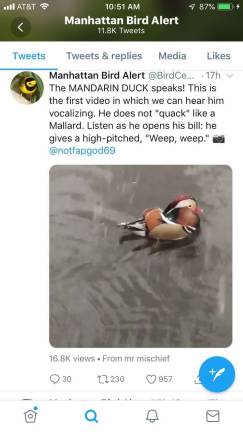 “Manhattan Bird Alert, I think it’s a great thing for all New Yorkers,” Barrett said. “It’s been very popular because of the Mandarin Duck. The purpose of it is to give the public a way to get birding news delivered to them quickly.”
