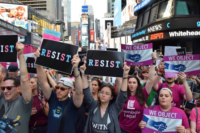 Following Trump’s announcement, a coalition of advocacy groups and politicians joined together to organize and sponsor the Times Square event, including Equality New York, Rise and Resist, the New York Civil Liberties Union and Lambda Legal. A number of politicians and activists spoke at the event, including Public Advocate Letitia James, Comptroller Scott Stringer, City Council Member Corey Johnson, and Tanya Walker, a transgender woman and U.S. Army veteran. “I did not obstruct the government by serving in the military,” Walker said, to cheers from the crowd.