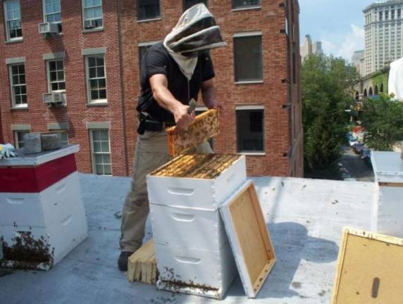 Fortunately, Cote may be the city’s preeminent beekeeper, by being passionate about responsible beekeeping and by doing his part to encourage healthy bee populations. It is he, along with two NYPD officer beekeepers, who the city calls to capture rogue swarms. There were quite a few of these this summer, with swarms ranging from equal to the size of a grapefruit to a backpack-sized behemoth composed of half a hive’s worth of bees — upwards of 30,000 little buzzers. Cote has a special vacuum that gently and safely sucks up the swarm, which he then transports to one of his less populous hives, where the bees continue to produce their delectable honey.