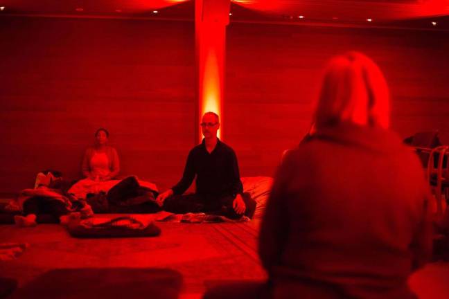 On a recent Friday night at the Rubin Museum, warm red light and cool hypnotic sound flooded the theater space. Bean bag chairs and yoga cushions were scattered across the floor. A handful of listeners sat upright, eyes closed; others released into peaceful savasanas on the floor as “9 Beet Stretch,” a rendition of Beethoven’s Ninth Symphony stretched to 24 hours with no pitch distortions by Scandinavian sound artist Leif Inge, washed over them. The mood, to this reporter, was very TGIF. Or perhaps it’s Saturday morning?