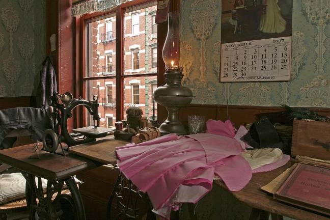 The first tour that I learned is the one of the sweatshop workers, and one of the stories we tell is of the Levine family who operated a dress shop out of their home. There is a replica of a dress that we don’t know for sure if the family made, but it was of the time, which was 1897. It’s a pink dress and it anchors the story, but also visually anchors the room. It was their life’s work to produce that dress, whether it was the husband of the family who was the tailor at the pedal-operated sewing machine working by daylight near then window and later on, kerosene light. There’s an ironing board in the kitchen, because that’s where any wrinkles were taken out of the dress so it could then go and be sold in the fancy department store.