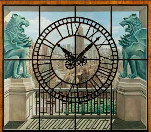 “To me, that pair of paintings performs the concept of the show, which is the loss of a view, the loss of a certain New York. That’s what really made the idea crystallize,” Ikemoto said in an interview. The spacious first-floor gallery is replete with memories of bygone days, a New York with El trains, river bathhouses, East River swimming, high wheel bicycles (“Penny Farthings”) and fine dining at the 21 Club, with the late, great caricaturist Al Hirschfeld seated at the bar and recording the scene.