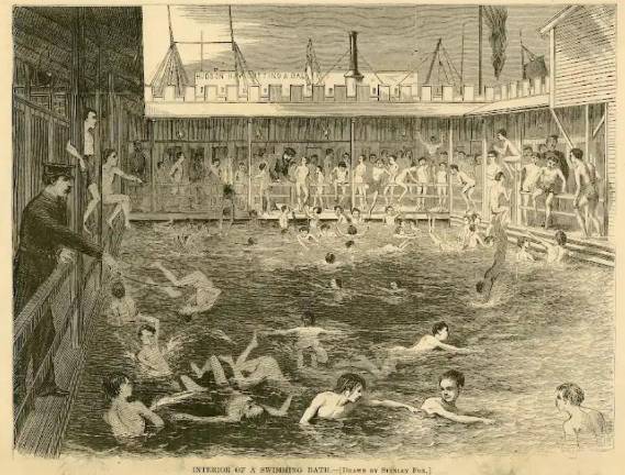 In the late 19th century, New Yorkers living in overcrowded quarters were mandated, for hygienic purposes, to visit river bathhouses (forerunners of public pools), described here as “floating structures with a central well sunk into the river water” and promoted as a safer alternative to river swimming. Several handsome wood engravings from the early 1870s and a small diorama paint the picture.