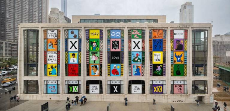 Nina Chanel Abney’s San Juan Heal exhibit David Geffen Hall façade, Lincoln Center