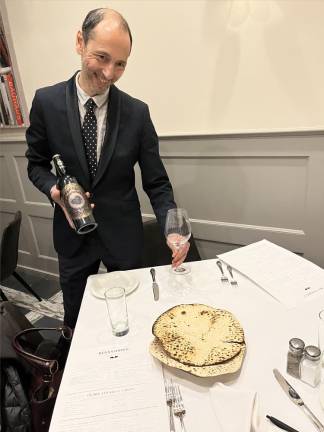 Benny John’s menu is traditional steakhouse. I brought along the shmura matzah I purchased from my Chabad rabbi and asked Faridj, BJ’s host, if there was kosher wine in the house. Voila. Out came the Parisian born Faridj with a beautifully decorated bottle of Domaine Noires Vainiers, Languedoc, France 2021. Instead of having him open the $95 bottle, I asked him to pose for a photo op holding the bottle alongside the round, kneaded shmura matzah which is shaped by hand. While it wasn’t a seder, it was the first night of Passover spent with a friend, the great wait staff at Benny John’s–George, Lorenzo, and Faridj–and shmura matzah and a bottle of unopened kosher wine. L’chaim.