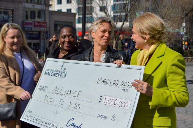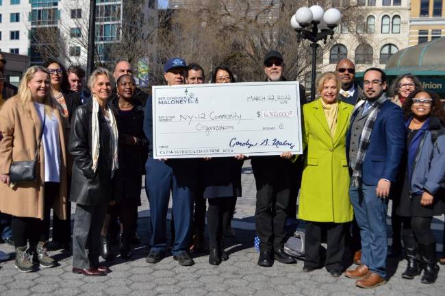 Jumbo-sized checks aren’t just for lottery winners or skilled game show contestants; in Manhattan, they’re for organizations dedicated to improving life in the city, too. “These groups behind me,” Rep. Carolyn Maloney said during a press event in Union Square on Tuesday, “are all leaders — and major parts of the communities that I represent.” She ceremoniously awarded checks on March 22 to representatives from a total of 10 organizations based in District 12 and beyond.