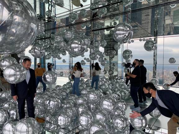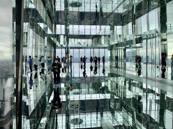 When you alight from the 45-second ride on the entrance elevators, your first destination is an infinity room utilizing a 40-foot ceiling. Named Air, it takes the observation deck, with mirrors on the ceiling, floor and sides, to provide a grand 200 foot by 60 foot entrance hall. The effect is heightened by floor to ceiling windows, with no visible structural elements to block your view.
