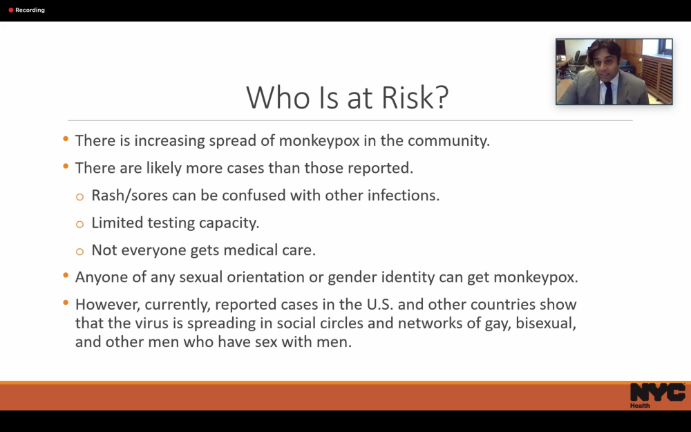 Destigmatizing is a big part of the messaging, Vasan said. “In this outbreak, it happens to be concentrated in the gay community, and specifically men who have sex with men,” he explained. “And that has to do with social networks, sexual networks. This is less to do about identity than it is about actions and behaviors.” It’s an intentional departure from the public health response in the early days of the H.I.V./AIDS epidemic, though it’s been a cause for conflict within the city’s health department, with some arguing that a stricter approach — “encouraging gay men to temporarily change their sexual behavior” — would better contain the spread, the New York Times reported.