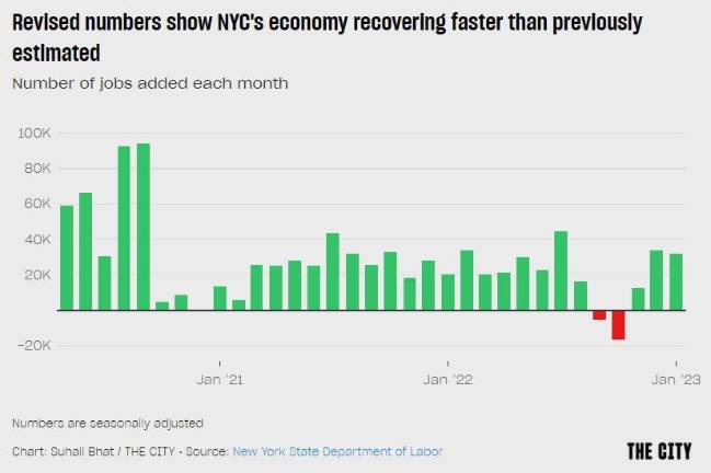 The nation as a whole has regained all the jobs lost in the shutdown and added about a million more. The new numbers suggest the official forecasts from the mayor, comptroller and Independent Budget Office that the city will not completely recover until late 2024 are too pessimistic.