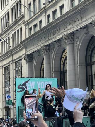 Then, slowly but surely, the parade began. Ticker-tape began to fall onto the crowded Broadway sidewalks, forming large clumps and leading a T-shirt seller to quip that it was “snowing.” By the time that Stewart’s float reached Trinity Church, she put down one of multiple gold champagne bottles that were being passed around, before briefly disembarking to give screaming fans the aforementioned high-fives.