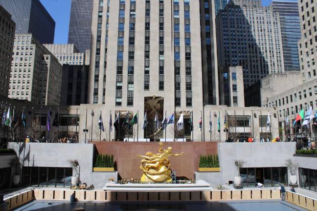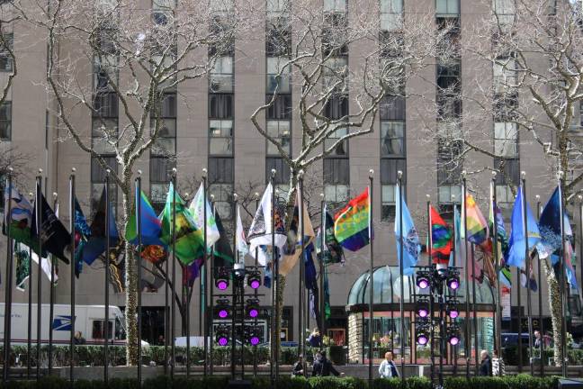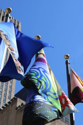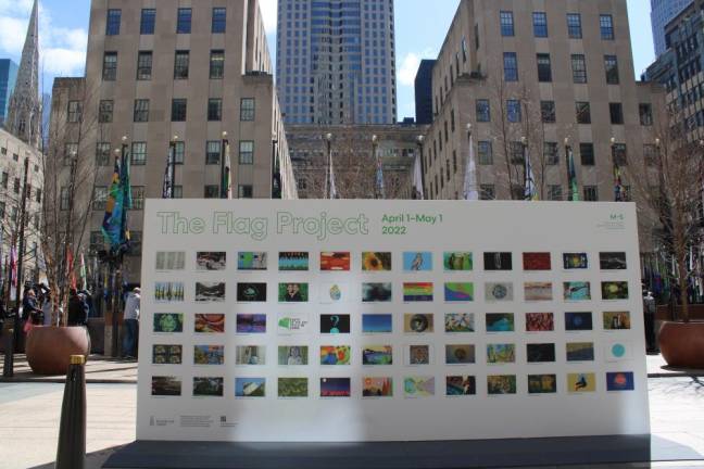The flags at Rockefeller Center wave in the wind, rippling in a kaleidoscope of designs. The colorful flags ring the central plaza and people wander around the area, snapping pictures and pointing out their favorite ones. In between the business complex and the iconic Prometheus statue sit two long white boards, which provide information about the installation as well as the images printed on each flag.