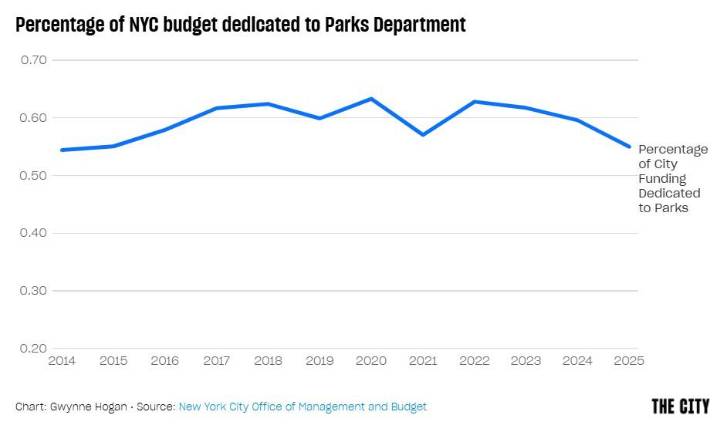 The Parks Department is getting $20 million less funding than last year even as the city budget grew by $5 billion. The $618 million for Parks in a $112.4 billion budget comes to 0.55 percent, the lowest share of funding set forth in an adopted budget in a decade.