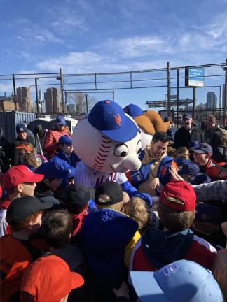 Coren did run into a little blowback at one point when he tried to lead a “Let’s Go Mets!” chant. He got some raspberries from at least half the kids sitting before him on the artificial turf who seemed to favor the Yankees. But that quickly changed when the Mets official team mascots, Mr. Met and Mrs. Met, made a surprise appearance on the field and were mobbed by the kids–even the Yankee fans.