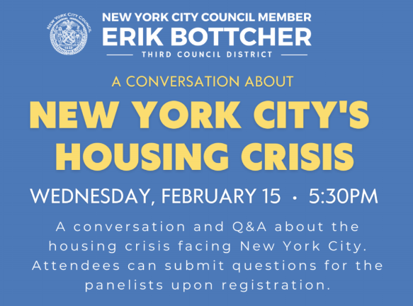 NYC Planning Commissioner Dan Garodnick and NYC Chief Housing Officer Jessica Katz joined in a forum called by Councilman Erik Bottcher on Feb. 15 to address the city’s looming housing crisis.