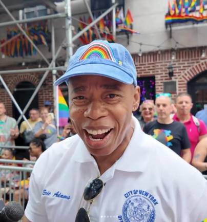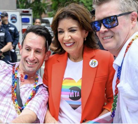 Politicians generally love the Pride Parade and their affections were vividly expressed by Governor Kathy Hochul, cheekily wearing an MTA Pride heart shirt on the exact day congestion pricing was to begin; Mayor Eric Adams ecstatic in a rainbow adorned ball cap; Senator Charles Schumer, with a rainbow flag tucked into a belt loop and a bullhorn-carrying aide beside him while he himself spoke into an attached microphone; Council Members Gale Brewer and Erik Bottcher; and others.