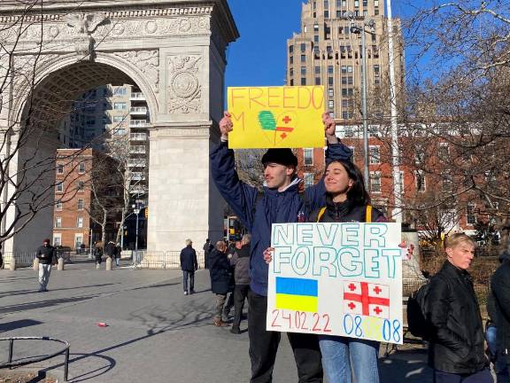 A line of antiwar protesters formed in front of the Washington Square Arch on February 27. Photos by Ava Manson