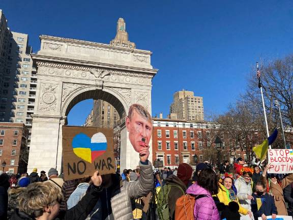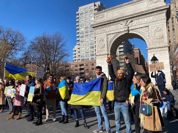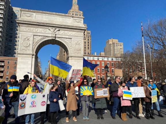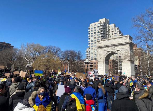 Crowds gathered in front of the Washington Square Arch on Sunday afternoon to rally in support of Ukraine in a sea of blue and yellow, holding signs that read “Stop the War” and “We Need Peace.”