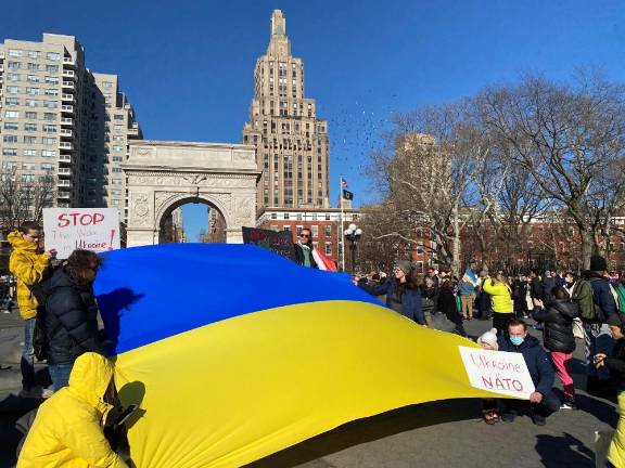 Ukrainian flag held in front of Washington Square Arch during February 27 rally.