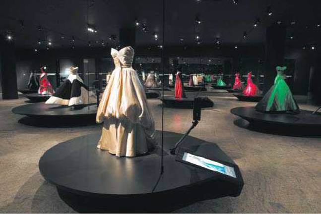 Charles James: Beyond Fashion is presented in two separate locations in the museum. The gowns, in hues of emerald, ruby, and pearly white and in shapes that evoke trees, swans and butterflies, are on view in the museum's special exhibition gallery on the first floor. Low pedestals in a darkened room spotlight these creations without glass cases. The curators wanted to allow a sense of intimacy in viewing the dresses. They're displayed only slightly higher than floor level, making it easy to imagine the swish and sway and sensation that wearing one would bring. You can walk around each piece, seeing the back and the front, and, in certain cases, even what lies beneath.