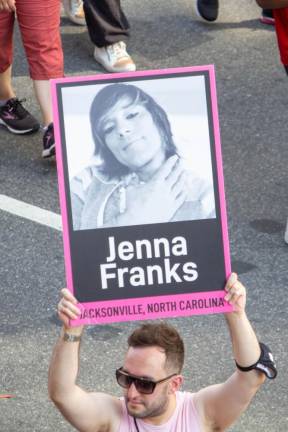A marcher carries a sign memorializing Jenna Franks, a trans woman murdered in North Carolina. Photo: Trish Rooney