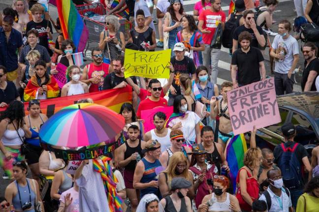 Signs supporting the end of Britney Spears's conservatorship at Pride 2021. Photo: Trish Rooney