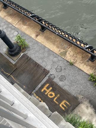Finally, Our Town paid a visit to the East 71st Street Esplanade diversion, near where the East 70th Street sinkhole is supposed to be. One conspicuous hole was visible under the metal ramp that has been leading pedestrians off the parkway, while a piece of plywood that simply had “HOLE” written on it was situated around 10 feet away. They could have represented one connected sinkhole with two entrances, or not. Either way, it looked dangerous.
