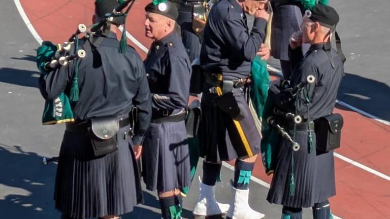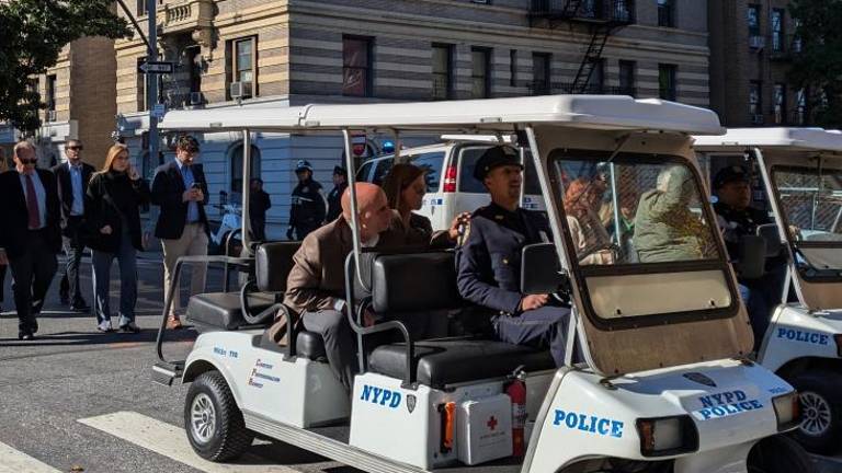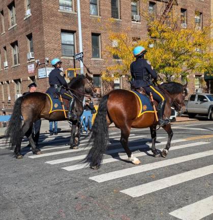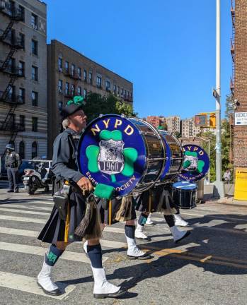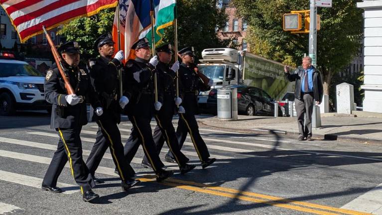 With scores of cops both active and retired talked amongst themselves, the line of march began its procession: two baby-blue helmet-clad mounted police; two white helmeted motorcycle cops; the kilt-clad pipers and drummers of the NYPD Emerald Society, followed by a color guard carrying American, New York, and NYPD flags; two NYPD buggies carrying the Buczek and Hoban familes; other officers and representatives of various police fraternal organizations, including the red jacketed members of the NYPD Pulaski Association, for Polish-American officers.
