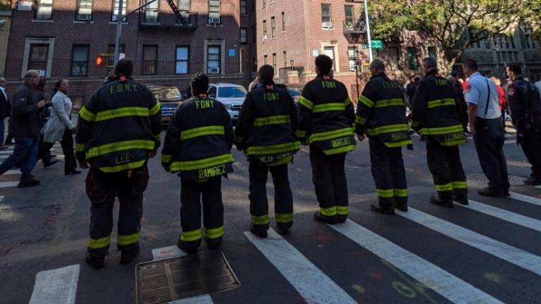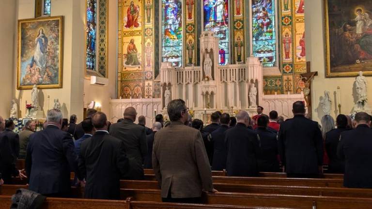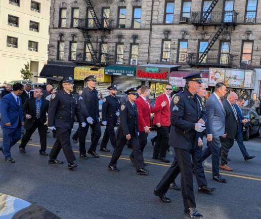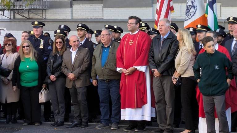 Up on the Wadsworth Avenue plateau, the march continued south to St. Elizabeth and the corner of W. 187th Street. In between, it was greeted by FDNY members and a large American flag hanging from their engine’s ladder. A southbound flyby by an NYPD helicopter thrilled the children present, included students from St. Elizabeth School, before everyone began entering the church. On the way in, many people shook hands with NYPD Chaplain Father Michael Eguino, who would also deliver the day’s homily.