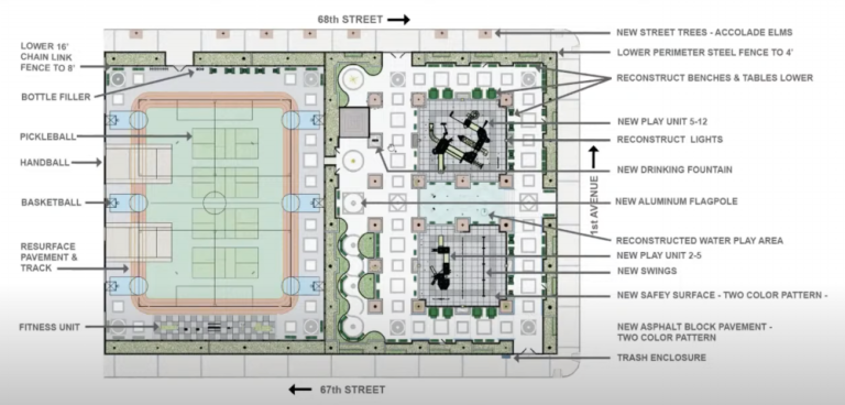 The reconstruction project has a $9 million budget, with $4.85 million from the mayor, $590,000 from city council, and $3.6 million from private corporations, including the New York Blood Center. An additional $250,000 is needed for renovating the park’s comfort station, though the funding and construction timeframes for that project are still unclear, according to parks officials who spoke at the meeting.