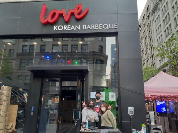 At Love Korean Barbecue in Koreatown at 32nd Street and Fifth Avenue, the energized sound of rap music greets passersby as a DJ bops to the beats behind large glass windows. Welcoming diners at a sidewalk table, host, Blanca Bravo and her co-workers were busy with a steady flow of people at dinner time. Love opened on Valentine’s Day last year and had to close a month later because of the pandemic. The additional space has given them a major boost she believes.