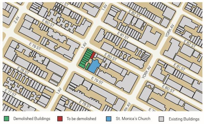 At issue is a vast construction site where Extell Development Co. this summer razed nine humble four-story buildings. Each had a footprint of roughly 2,000 square feet, and together they housed 11 retailers and 104 apartments abutting historic St. Monica’s Roman Catholic Church on East 79th Street.