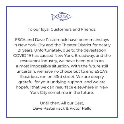 For some, the financial string has run out. ESCA, a celebrated fish restaurant near the corner of West 43d Street and Ninth Avenue, announced it was closing after months of waiting in vain for the return of its three main sources of customers: Broadway theater-goers, tourists and Midtown office workers. “We have been put in an almost impossible situation,” owners Dave Pasternack and Victor Rollo, posted on the restaurant’s website. “With the future still uncertain, we have no choice but to end ESCA’s illustrious run on 43d street.”