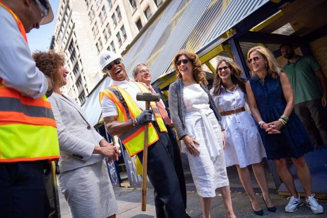 “The blight and disorder that we are witnessing at some of our sites is unacceptable,” the mayor declared, just before donning a hard hat, safety vest and that sledgehammer, which he wielded to take down an abandoned dining shed at 32d Street and Fifth Avenue. He said he could smell the urine from the shed.