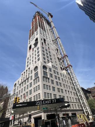 Towering over the surrounding environment and slated to be completed next fall, Naftali Group’s luxury residential tower at 255 E. 77th St. finally has a roof. Condominium reservations are set at millions of dollars.