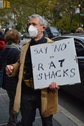 Protesters didn’t seem impressed by any economic benefit of the outdoor dining program, chanting, “restaurants get the money, we get the shaft.” They also expressed concern about the upkeep of curbside sheds — particularly in relation to rodent infestations. “Of course” the structures attract rats, Sharon Hershkowitz said. “That’s a given.” She attended the protest wearing rubber rats around her neck and as finger puppets.