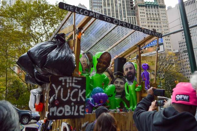 A mock dining shed on wheels stalled briefly in front of City Council members’ offices downtown, at 250 Broadway, in the early afternoon on Tuesday, Nov. 15. It held trash bags, plus the faces of some of New York’s politicians plastered on inflatable aliens — and blared a cacophony of voices, music and sounds too grating to identify, nearly drowning out the shouts of people who had congregated to protest permanent outdoor dining.