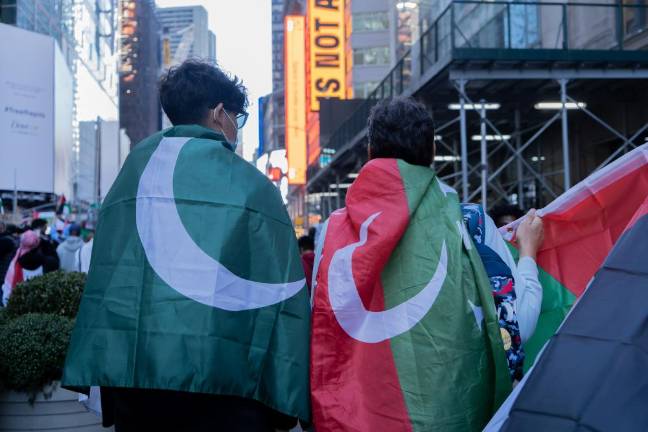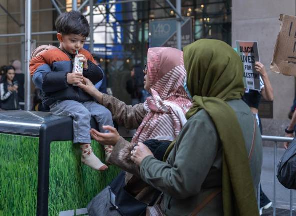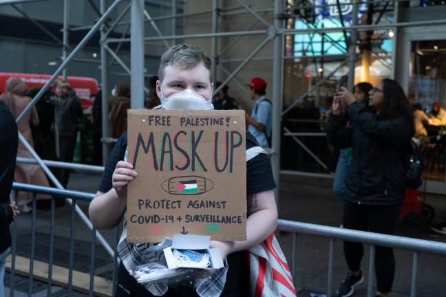 Ahmad, a Pakistani-born resident of New Jersey, expressed horror at the situation in Gaza, which he described as a prison being bombarded from above. “Tell me one instance in history where people were caged and then bombed,” he said. “I don’t know. For me, Palestine is a litmus test for humanity... if you don’t get it, I think it’s only because either you don’t want to or you need to know more.” Ahmad came to the rally with his son, who covered his face for fear that he might be identified and fall victim to retaliation for his beliefs.