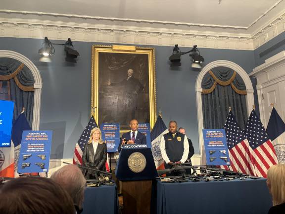 “We knew we were being successful in bringing down crime,” Adams said. At the same time, he acknowledged, “but the reality was that New Yorkers weren’t feeling safe. And we wanted to match that. And we knew we had to make sure that our strategy was about removing illegal guns from our streets. As you see, these examples here, these are not props. These are guns that bad people were carrying. Just look at these weapons that you see here and with a scope, you’re seeing weapons that are very dangerous, automatic weapons.”