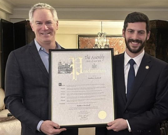 Matthew Tirschwell, the volunteer EMT who jumped into action to save the life of a man who had tumbled onto the subway tracks on the Upper East Side, was awarded with an official Proclamation on April 21 by Assembly Member Alex Bores.