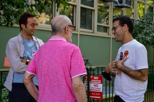 At Bayard Rustin Education Campus, on West 18th Street between Eighth and Ninth Avenues, fellow candidate Tony Simone campaigned beside State Senator Brad Hoylman, hoping to appeal to voters.