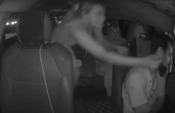 Video of the attack shows Guilbeault, clad in a light-colored spaghetti-strap dress, and another female passenger, texting on their phones when the muscular Guillebault, suddenly ferocious and glaring eyed, launches her attack.
