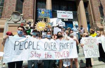 New York Blood Center tower protest, Sunday, May 23, 2021, on the Upper East Side. Photo: Diane Bondareff ‘Stop the Tower’ Community Board 8 took action on Tuesday, May 25 against the New York Blood Center’s divisive plan to build a 334-foot life... News 28 May 2021 | 10:29