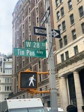 The new Tin Pan Alley Sign on 28th Street and Broadway. Photo: Kay Bontempo Tin Pan Alley Recognized With Official Street Sign New Yorkers gathered on a recent Saturday at the corner of Broadway and West 28th Street to place a sign officially commemorating... News 13 Apr 2022 | 01:02