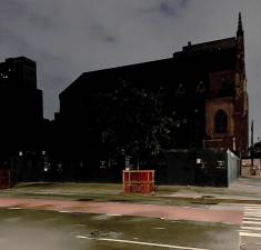 Historic St. Monica's Church on East 79th Street looms inthe background in this view looking east across First Avenue. It'sonly 9 p.m., but the full block near an Extell construction site isdark, desolate and completely deserted. ( Photo: Sandra Lerner) The Black Hole of East 79th Street One of the most high-profile street corners on the Upper East Side has become a dead zone at night – dark and desolate, shadowy... News 09 Sep 2019 | 11:40