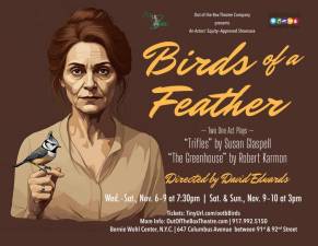 “Birds of a Feather” features two one-act plays: ”Trifles” by Susan Glaspell and ”The Greenhouse” by Robert Karmon. ( Photo via OutOfTheBoxTheatre.com) Out of the Box Theatre Starts New Season with 2 1-Act Plays Out of the Box Theatre Company is kicking off its next season in early November with six performances of “Birds of a Feather,”... News 21 Oct 2024 | 04:27