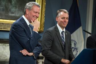 Mayor Bill de Blasio announcing that Dermot Shea (right) will be next Commissioner of the New York Police Department, at City Hall on November 4, 2019. ( Photo: Ed Reed/Mayoral Photography Office) Big Challenges for New Police Boss Each month, Dermot Shea sits with other top New York City police officials and the mayor to brief reporters on the latest... News 12 Nov 2019 | 12:31