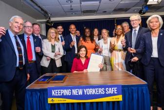 Gov. Hochul and e-bike accident victim Rabbi Miller (second from right) along with other legislators, at the July 11 event where seven new e-bike regulations were signed into law. ( Photo: Susan Watts, Office of Governor Kathy Hochul) E-Bike Dangers Trigger Flurry of New State Laws; Bores and Hoylman-Sigal Play Big Roles A sweeping new set of rules governing lithium-ion batteries and e-bikes, including the first ever requirement to register... News 15 Jul 2024 | 05:20
