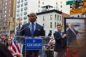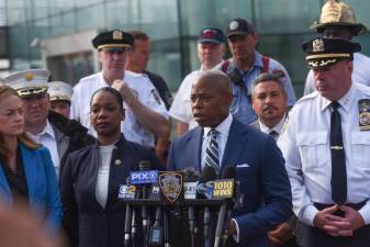 Hand on heart: Pols and VIPs during pre-parade ceremony for the Dominican Day parade on Aug. 10. ( Photo: Darren McGee/Office of Governor ) Dominican Day Parade Delights Midtown Multitudes — Loudly! Hundreds of thousands of red-white-and-blue-adorned spectators and participants crowded Sixth Avenue from the 36th to 55th... News 16 Aug 2025 | 01:46