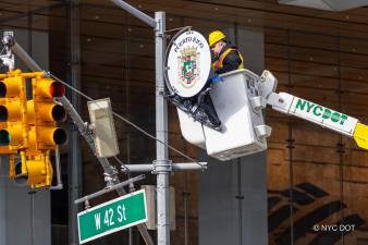A construction worker placing the medallion on W 42nd St. one of 172 new ones along Avenue of the Americas stretching from Canal St. to 59th St. Photo: NYC DOT Officials Unveil 172 New National Medallions Along Avenue of the Americas Paying homage to New York City’s global diaspora that’s helped make it a truly cosmopolitan city, city officials on Nov.... News 16 Nov 2023 | 05:29